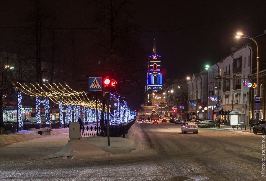 Отснял я сегодня несколько кадров ночной Перми с праздничной иллюминацией. Третьего дня еще это место приглянулось. Действительно красиво и даже строительная сетка на колокольне Пермской художественной галереи изукрашена, а не черным пятном на черном небе смотрится. Или сетку убрали? Надо днем как-нибудь посмотреть. А вы любите ходить смотреть на шпиль бывшего Спасо-Преображенского собора в Перми? Вечер последнего дня новогодних каникул, а по бульвару гуляет много народу, в том числе и с детьми. Фотографируются на телефоны, интересно, что у них получается? Чуть поближе. Вид с перекрестка Комсомольского проспекта и улицы Советской. Сегодня в Перми -15, самое время зайти куда-нибудь согреться. Вот мы и завернули, нет, не в Дочку Мясника, а в расположенный напротив Smoky Dog - еще одно заведение для любителей интересного пива. Само заведение инсталлировано в трехэтажный дом позапрошлого века. Прямо на входе меня зацепила ведущая на самый верх лестница. Даже если она не оригинальная,