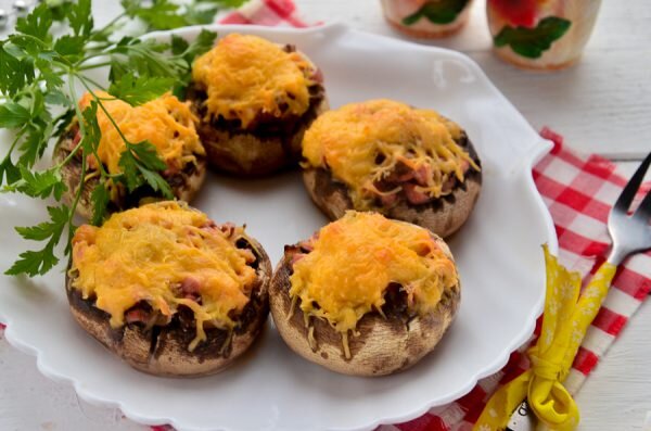 Шампиньоны, фаршированные колбасой. Запекаем в духовке