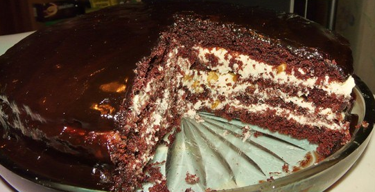 Ингредиенты Пшеничная мука 1,5 стакана Сахар 2 стакана Сметана 20%-ная 6 столовых ложек Сгущенное молоко 6 столовых ложек Сода 2 чайные ложки Какао-порошок 7 столовых ложек Сливочное масло 300 г Молоко 0,6 л Манная крупа 4 столовые ложки Ванилин щепотка Коньяк 3 мл Грецкие орехи 25 штук Яйцо куриное 2 штуки 1. Яйца и стакан сахара взбить, добавить сметану, 2 чайной ложки соды, погашенной уксусом, сгущенку, 4 столовых ложки какао. Перемешивать эту смесь нужно в блендере или комбайне. Затем добавить полтора стакана муки и тщательно перемешать. 2. Половину смеси вылить в заранее смазанную маслом форму для выпекания. Выпекать 30-40 минут в предварительно разогретой до 130–140 градусов. В зависимости от мощности духовки температура и время приготовления может варьироваться. Чтобы проверить готовность коржа — проткните зубочисткой. Если на зубочистки осталось тесто, то продолжайте выпекать. 3. Для более легкого изъятия коржа из формы поставьте его на смоченную холодной во
