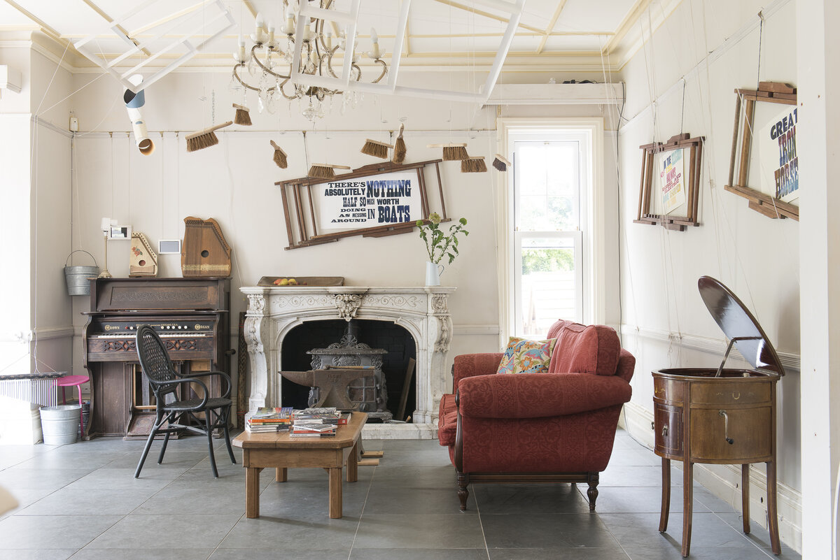 Сегодняшняя история про дом, который больше напоминает репетиционную площадку театрального кружка. Но, ведь таковым он и является. Владельцы особняка организовали свой небольшой театр много лет тому назад. Здание, как и полагается креативным умам, находится в историческом районе, в окружении колоритных экстерьеров. Внутри все пропитано духом «сумасшедшего шляпника» из известной сказки Льюиса Кэрролла «Алиса в Стране чудес». Каждая вещь в окружении интерьера уникальна и очень гармонирует с настроением хозяев. История здания начинается с конца 19 века, подобно тому, будто открываешь страницы рассказов мастеров чтива того времени. Попадая в дом с главного входа, первое, что бросается в глаза, конечно, парящая арка из книг, которая по совместительству визуально напоминает мост между столетиями. Продвигаясь дальше по коридору, невозможно не заметить светло-серый пол и старинные обои с изображением птиц, украшающие стены проходной зоны. Далее коридор соединяет несколько комнат и выход на т