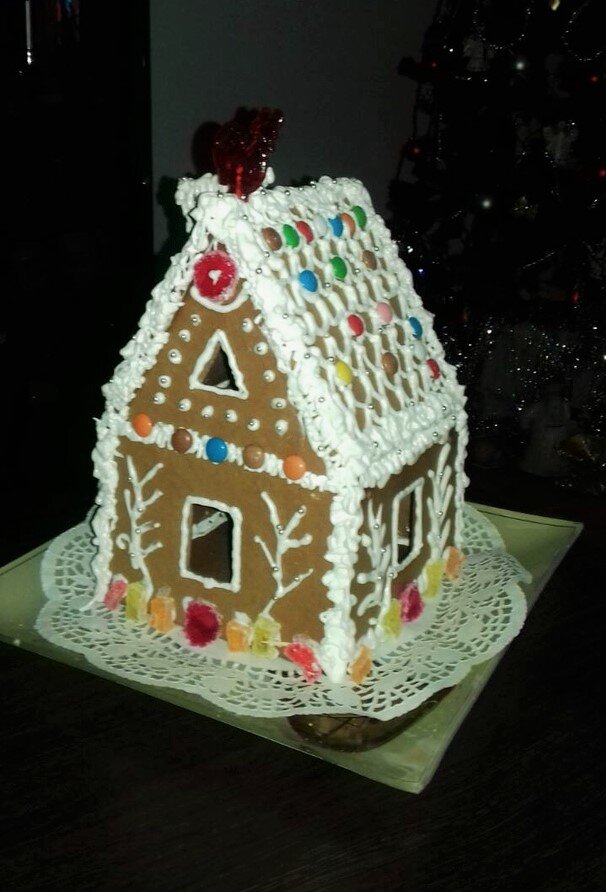 Добрый день, друзья. Ну вот и прошло Рождество. Не за горами и Старый Новый год. Хотя его отмечать у большинства россиян сил уже не хватает)). И так нашей любимой печени был нанесен «капитальный урон». А тут еще и этот праздник. Поэтому решила поделиться рецептурой и самим процессом изготовления пряничного домика. Не стала мучить вас блюдами из говядины, свинины, курицы (то бишь мяса), овощей, солений и т.д., а решила побаловать вас сладеньким. Данный пряничный тортик как никогда подойдет к праздничному столу. Ну что же, начнем. В приготовлении данного сказочного домика необходимы следующие составляющие: Для теста - мука (2 стакана с горкой) - мед (4 ст.л.) - сливочное масло (150 г) - сода (½ ч.л.) - щепотка соли - корица (2 ч.л.) - молотый имбирь (2 ч.л.) - сахарная пудра (6 ст.л.) - сырой желток (2 шт.) Для глазури - белки (12 шт.) - сахарная пудра (3 стакана) - лимонный сок (2 ч.л.) Для украшения - леденцы (100 г) - драже (100г) - мармеладные конфетки (100 г) Сам процесс из