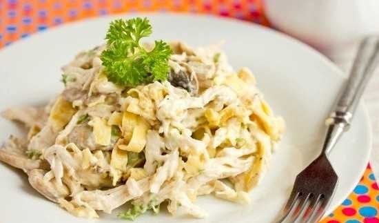 Ингредиенты: Отварная говядина (можно заменить на другое мясо, птицу, язык, ветчину, балык, шашлык и тд.) - 450 г. Соленые огурцы - 200 - 250 г. Репчатый лук - 4-5 шт. Мускатный орех - 1 ч.л. Коньяк - 60 мл. Морковь - 2 шт. Майонез - для заправки. Яйца - 6 шт. Молоко - 50-70 мл. Соль - по вкусу. Растительное масло - для жарки. Приготовление: На растительном масле обжариваем лук до готовности, в конце добавляем 1/2 ч.л. мускатного ореха и 30 мл. коньяка, как только коньяк испариться - лук готов. Морковь можно нарезать, а можно натереть на крупной тёрке. Также обжариваем до готовности, в конце добавляем 1/2 ч.л. мускатного ореха и 30 мл. коньяка, как только коньяк испариться - морковь готова. К яйцам добавляем молоко, соль, тщательно взбиваем. Из полученной смеси жарим яичные блинчики. Соломкой нарезаем отварную говядину, огурцы и блинчики. Все ингредиенты, вместе с луком и морковью перемешиваем с майонезом. Подписывайтесь и ждите множество интересных рецептов, также жду ваших комм