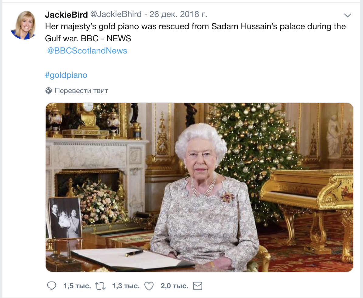 Не менее интересны попытки журналистов ее отмазать: https://twitter.com/JackieBhird/status/1077879751103123456, только вдумайтесь, золотой рояль ее Высочества был спасен из дворца Саддама Хуссейна во время войны в заливе. Как мило. Интересно, рояль вытаскивали в тот же момент когда Саддама вешали или чуть попозже? На дворе, напоминаю, стоял декабрь 2018 года. Королева Великобритании наслаждается ворованым [зачеркнуто] спасенным имуществом Саддама Хуссейна, повешенного после вторжения в Ирак по надуманному, лживому поводу. Но где же взрыв в СМИ? Где обличения? Массовый протест? А нету. Ибо демократия. Думаю все согласятся, что для старушки отлично подходит тег #ThiefQueenElizabethII