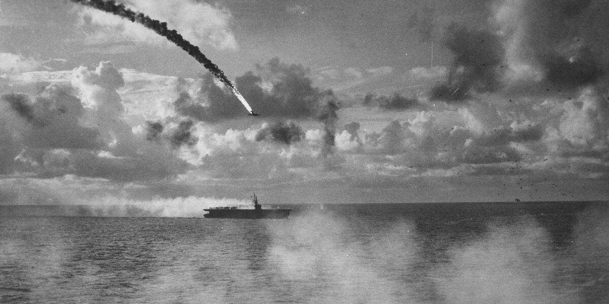 В январе 1945 года японцы пытались потопить американские корабли с помощью камикадзе, других способов у них не осталось. Во время одной из таких попыток, когда японские летчики зашли в очередную самоубийственную атаку на американские корабли, один из них, то ли из-за повреждения, то ли из-за того, что неудачно выполнил заход, на низкой высоте пролетел между шедшими рядом линкором «Вест Вирджиния» и эскортным авианосцем «Натома Бей». Линкор не стал открывать огонь по летящему японцу, так как был большой риск повредить своим огнем авианосец. А вот на авианосце об этом думать не стали и открыли по японскому самолету ураганный огонь из всех зенитных средств. Японцу достались далеко не все снаряды, большая часть прилетела в линкор. На линкоре подумали, что ответить в ответ на такой «подарочек» от коллег. А потом подняли сигнал: «Натома Бей, просим прекратить огонь, мы сдаемся!» P.S. На фотографии - атака камикадзе, но другая.