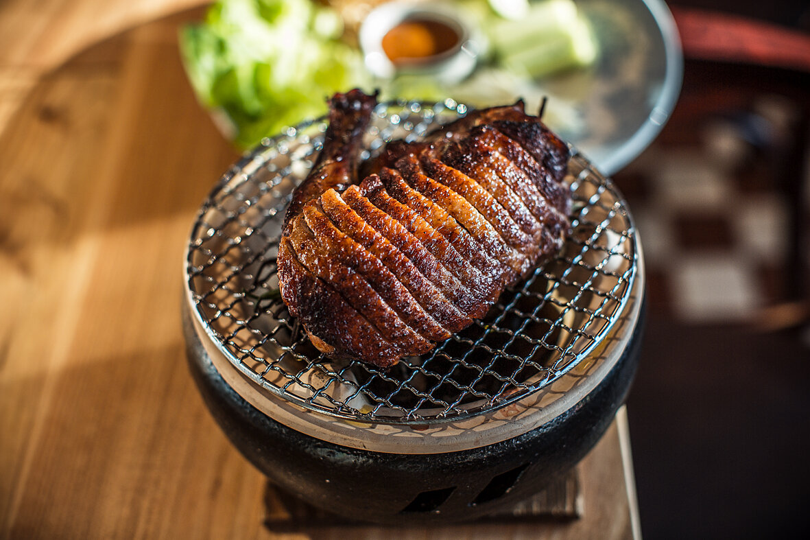 Итого: 1450 рублей "Мне нравится сочетание европейского и азиатского в одном блюде. Например, утка BBQ коптится на розмарине и подается очень эффектно – на корейском гриле с углями. К ней я подаю разные овощи и соусы, чтобы есть утку, закручивая ролл в салатный лист. Ну а про торт и говорить нечего – что может быть лучше сочетания фисташек, малины и мусса из белого шоколада?" Владимир Чистяков