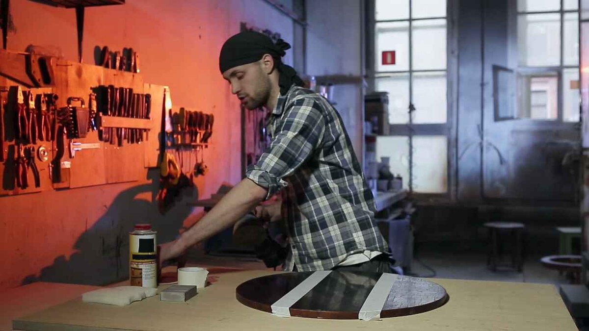 Реставратор Тимофей Голубков показывает три разных способа снятия лакокрасочного покрытия с деревянной мебели. Ограничить участки, на которых нужно снять лакокрасочное покрытие, с помощью малярного скотча. Снять лакокрасочное покрытие можно шлифовальной машинкой с кругом зернистости 120 (среднее зерно, которое не царапает поверхность). Следует учитывать, что машинка двигается в 2х плоскостях: по кругу и от себя к себе. В процессе работы машинка может оставить спиралевидные следы, поэтому нажимать сильно не стоит, двигаться машинкой нужно плавно по волокнам, чтобы не поцарапать шпон. Шлифовать нужно всей поверхностью машинки, нельзя делать это под углом, в противном случае можно оставить бороздку и сломать машинку. Такой способ является самым удобным и самым быстрым, но не всегда подходит для реставрации, так как шлифмашинка может оставить царапины, которые проявится при лакировке. В случае отсутствия шлифмашинки, можно воспользоваться циклей. Для начала следует зафиксировать столеш