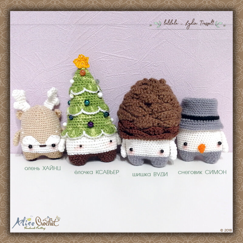 Дата проекта: декабрь 2018 г. Техника: вязание крючком, amigurumi Размер: шишка Вуди - 10,5 см, олень Хайнц - 12 см, снеговик Симон - 9 см, ёлочка Ксавьер - 15 см Материалы: пряжа (остатки), бусины, нить, игла Крючок №: 2,0 Источник описания модели: интернет, автор Lydia Tresselt Приветствуем наших зимних друзей! Мы нашли их в чаще волшебного леса Лалилаленда: сосновая шишка ВУДИ, олень ХАЙНЦ, снеговик ВУДИ и елка КСАВЬЕР. Лалилалики: https://handmade-miralise.blogspot.com/2019/01/lalylala.html