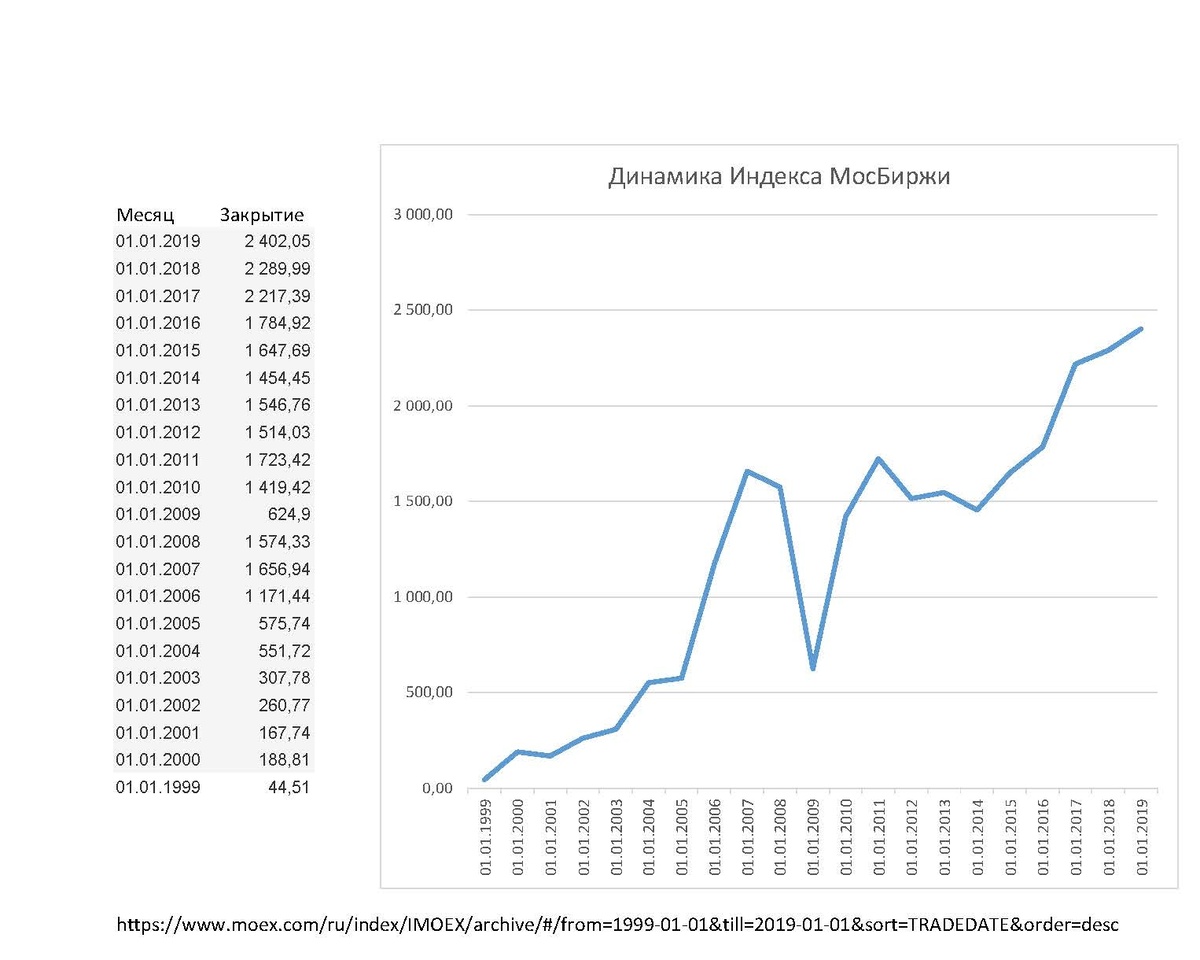 Это выгодно, эффективно на длительном периоде и занимает мало времени. Формируем портфель на основе индекса Какие акции выбрать? В данной статье расскажу об инвестировании акций в России. Ввиду высокой монополизации рынка, можно выбрать портфель из акций, входящих в индексы РТС и МосБиржи. В индекс МосБиржи входят 42 акции, самые крупные доли занимают Газпром, Лукойл, Сбербанк (более 10 % портфеля). Меньшие значения, около 5% - НорНикель, Новатек, Роснефть, Татнефть и другие. С полным списком можно ознакомиться здесь: https://www.moex.com/ru/index/IMOEX/constituents/ Предлагаю для инвестирования выбрать акции, входящие в данный индекс, причем нужно смотреть на вес конкретной акции в индексе, и выбирать тот же вес в портфеле акций. Краткая информация по доходности по месяцам (январь каждого года) значения на сейчас (09.01.2019) - 2402 пунктов. 3 года назад - 1785 (рост 34% за 3 года) 5 лет назад - 1454 (рост 65% за 5 лет) 10 лет назад - 624 (рост 284% за 10 лет) 15 лет назад - 551