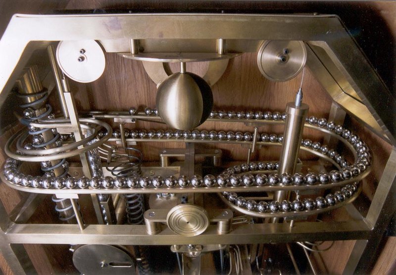Я очень люблю различные механические устройства, в том числе часы, и давно занимаюсь антиквариатом. В этой статье попробую совместить две этих темы. Часы - это целый мир, в котором очень много всего интересного, но сегодня мы поговорим о том, что называется "rolling ball clock", или часы с катящимся шаром (шарами). Rolling ball clock - это такие часы, в которых прерывателем выступает шарик, катящийся по рельсам или платформе (или несколько шариков). Выглядеть это может по разному, например так: Часы с катящимися шарами начали делать в XVII веке (предположительно, так как точной информации найти не вышло) . Я не знаю, кого считать их изобретателем, но широкую известность им принес французский изобретатель Николя Гролье де Сервьер, известный созданием множества фантастических машин. После его смерти потомки опубликовали книгу под названием "Сборник любопытных работ по математике и механике, или описание кабинета господина Гролье де Сервьера", в которой были описаны несколько моделей