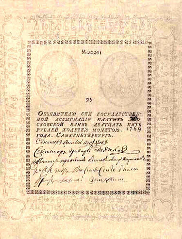 Например, что бы доставить в столицу подушный налог из других губерний, приходилось формировать целые обозы, где на одной телеге можно было перевезти не более 500 рублей медной монетой. Первым русским государем, который планировал ввести в России бумажные деньги, был Петр III, который, как известно, был отстранен от власти в ходе дворцового переворота. Одновременно