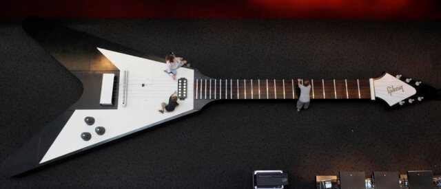 Для этой статьи больше подходит второй вариант. И хотя особого смысла представленные здесь инструменты не несут, выглядят они потрясающе. Самая большая гитара Является копией гитары Gibson Flying V, масштаб которой - 1:12. Впервые зазвучала 6 июня 2000 года. Строилась она с 1999 года техасскими студентами из Conroe, которые потратили на создание этого рекордного (но бесполезного для игры в её классическом понимании) 3000 американских долларов. Весит инструмент 907 кг, в ширину достигает 5,01 метра, в длину - 13,29. Это рост примерно восьми среднестатистических человек! Да, хоть играть на ней привычные мелодии у вас, скорее всего, не получиться, возможность извлечь звук из струн есть, так что на самой большой гитаре даже м