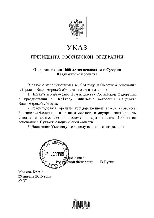 Сейчас город готовится к своему 1000-летию, которое будет отмечать в 2024 году. 29.01.2015г. Президент Российской Федерации В.Путин подписал Указ №37 «О праздновании 1000-летия основания г.Суздаля Владимирской области».