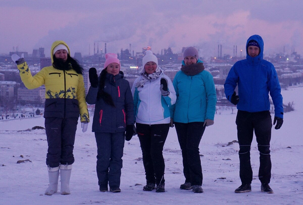 7-го января небольшой группой в 8 человек мы отправились к скале Медведь-камень, которая находится неподалеку от Нижнего Тагила. По дороге к камню, мы заехали во второй по величине город Свердловской области, чтобы подняться на Лисью горку, где очень хотели полюбоваться восходом солнца. Но было немного облачно и мы смогли полюбоваться лишь дымящим заводом.