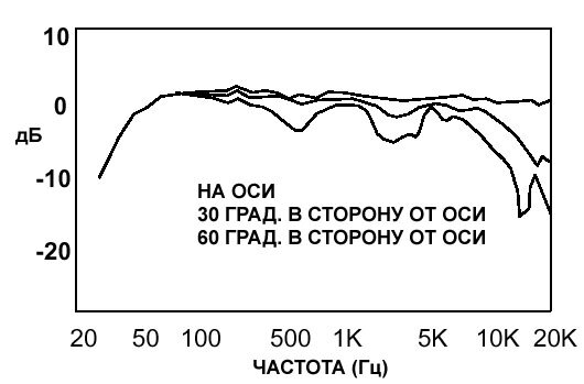 Стоит отметить, что коррекция АЧХ при помощи эквалайзера (в дальнейшем просто эквализация) эту проблему НЕ решает. Изменение формы «комнатной» кривой разрушило бы то единственное хорошее, что у этих АС есть - прекрасную осевую АЧХ. Можно заставить АС звучать по-другому, может быть где-то даже в лучшую сторону, но сравнять их звучание со звучанием АС, сконструированных грамотно во всех отношениях НЕВОЗМОЖНО. Чтобы избежать появления окраски при взаимодействии с КдП АС должны хорошо вести себя не только на главной оси, но и на остальных (и на 30°, и на 60° от главной) тоже. Если АС сконструированы так, что их направленность как функция частоты относительно постоянна, то в этом случаеточный тембральный почерк всех трех категорий звучания (прямой звук, ранние отражения и все остальные отзвуки) становится реальностью. Вот откуда берется хороший звук.