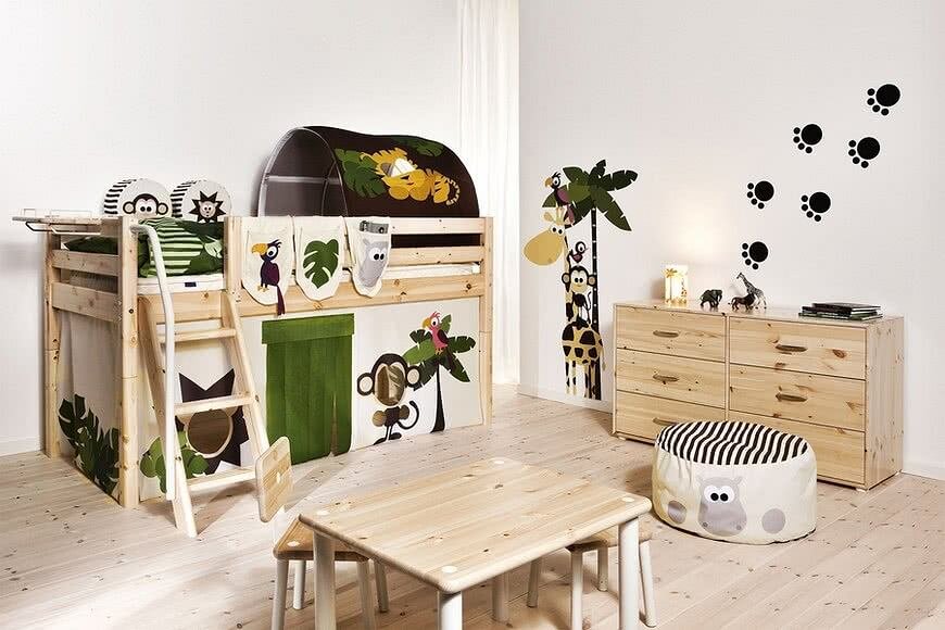 1. Кровать с барьером для ребенка. Эта комната позволит нашим детям почувствовать себя в настоящих джунглях. Здесь много шкафчиков и уголков. 2. Кровать для детского коттеджа. Посмотрите, как превратить обычную двухъярусную кровать в уникальное и сказочное место, которое понравится каждому ребенку. Коттедж идеально подойдет для комнаты маленьких девочек. Конечно, он послужит не только местом отдыха, но и фантастическим развлечением.