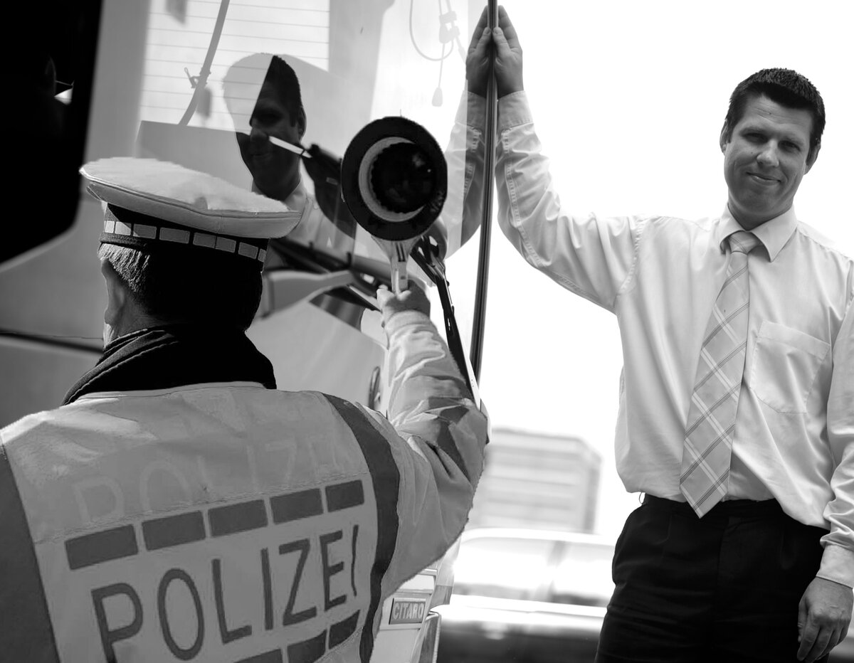 Он ехал на автобусе из Баварии в город Берлин. Уже подъезжал к центральному автовокзалу по многополосной дороге. Он ехал по центральной полосе и ему нужно было перестроиться на правую полосу. Посмотрев по сторонам в зеркалах бокового и заднего вида, Виталий не увидел никаких машин, включил правый поворот и начал перестраиваться. В это время он услышал звуковой предупреждающий сигнал о том, что имеется опасность фронтального столкновения. Виталий затормозил и вернулся на среднюю полосу. В это время его обогнал легковой автомобиль. Как ему показалось, водитель помахал ему рукой, но не остановился, а проехал дальше. Приехав на стоянку, Виталий внимательно осмотрел автобус со всех сторон - автобус был чёрного цвета, и любые, даже мелкие царапины и повреждения, были бы заметны сразу. Но никаких повреждений либо царапин Виталий не обнаружил и успокоился. А спустя несколько недель, к нему подошёл диспетчер и сказал, что получено сообщение из полиции о том, что на дороге произошло ДТП с участием Виталия, и передал ему приглашение явиться в полицию.