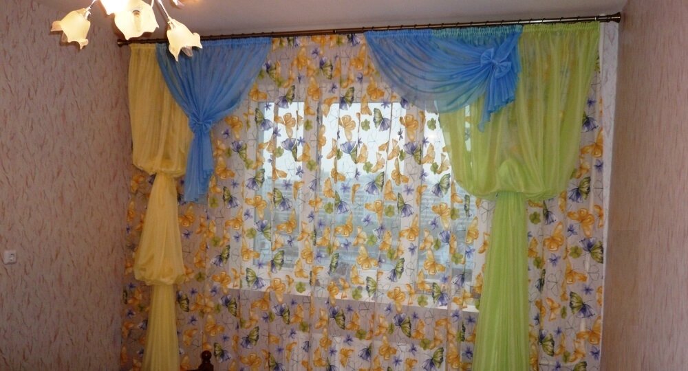Есть такая драпировка, называется - епископский рукав. Когда вдруг захочется каких либо наворотов, можно их устроить, не обращаясь к специалистам. Ибо это может сделать кто угодно. Простенький вариант Декор не сложный и при этом - милый. Такие два экземпляра из вуали я сшила для девочковой комнаты. Один из них - с двумя напусками, а второй - с одним. Тем не менее, простые элементы сложились в позитивную картинку, напоминающую деревья, небо и множество порхающих бабочек. Высокое окно Хороший вариант для узкого и высокого окна. Например, данный проём (на фото слева) шириной 0,9 м, и высотой около 6 м. Здесь я использовала принцип, по которому монтируется епископский рукав, хотя данное конкретное сооружение (так сказать) я бы всё же назвала шторой. Потому что верх растянула почти на целый метр, и "юбку" тоже. Дорогой вариант Если взять золотую парчу, как на фотографии справа, можно получить поистине дворцовый элемент декора. В данном случае использован прямой длинный кусок ткани, из ко