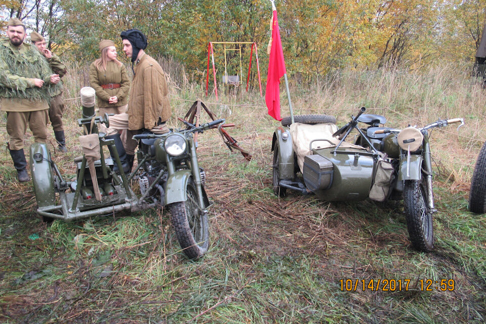 Рядом с самоходным минометом настоящий солдат и трудяга М-72 с коляской. Реконструкторская реплика конечно,