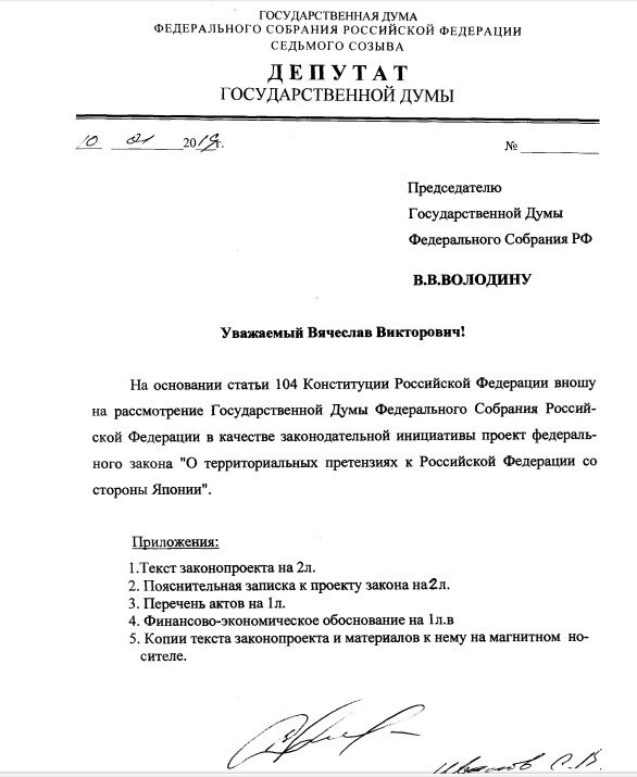 Сегодня в Госдуме внесен проект радикального закона по Курилам, защищающий территориальную целостность России, жителей России и нашу великую российскую историю. Это законопроект о немедленном запрете (праве вето) на рассмотрение любых актов, касающихся вопросов отторжения от России Курильских островов, Закон «О территориальных претензиях к Российской Федерации со стороны Японии» - вот ссылка на текст закона на сайте Госдумы Скриншот внесения Законопроекта на сайте Госдумы Напомню, после недавних бравурных и необоснованных заявлений со стороны премьер-министра Японии С.Або, некоторых японских официальных лиц и прессы о якобы бесспорной передаче некоторых островов Курильской гряды Японии, в российском обществе поднялось и не утихает серьезное возмущение и протест.