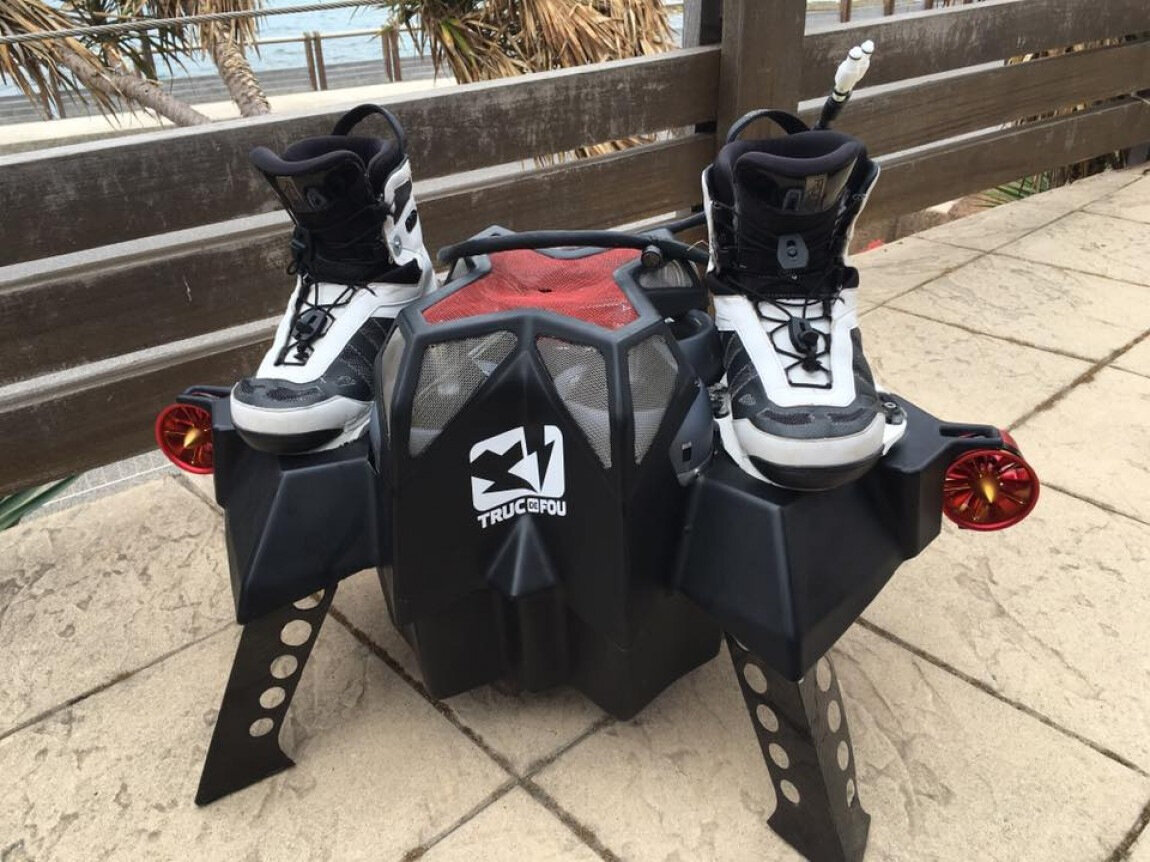 FLYBOARD AIR Перед вами индивидуальный летательный аппарат который представляет собой достойную и более технологичную замену гироскутерам , ховербордам и реактивным ранцам . FLYBOARD AIR выглядит как транспорт будущего и навевает мысли о временах , когда люди пересядут с автомобилей и общественного транспорта на летательные аппараты . Это средство передвижения сконструированного на основе обычного FLYBOARDа который чтобы поднимать человека в воздух использует мощные струи воды . FLYBOARD AIR в свою очередь оснащен реактивными двигателями которые работают на керосиновом топливе , оно поступает к двигателю из ранца за спиной пилота , таким образом создателям удалось избавится от лишних труб и проводов приковывающих аппарат к земле . В руке у пилота находится пульт управления , по словам создателей самым сложным этапом создания FLYBOARD AIR стала разработка двигателя . Не так то просто было его сконструировать таким образом чтобы он имел небольшой вес (около 3 кг) , выдавал более 30