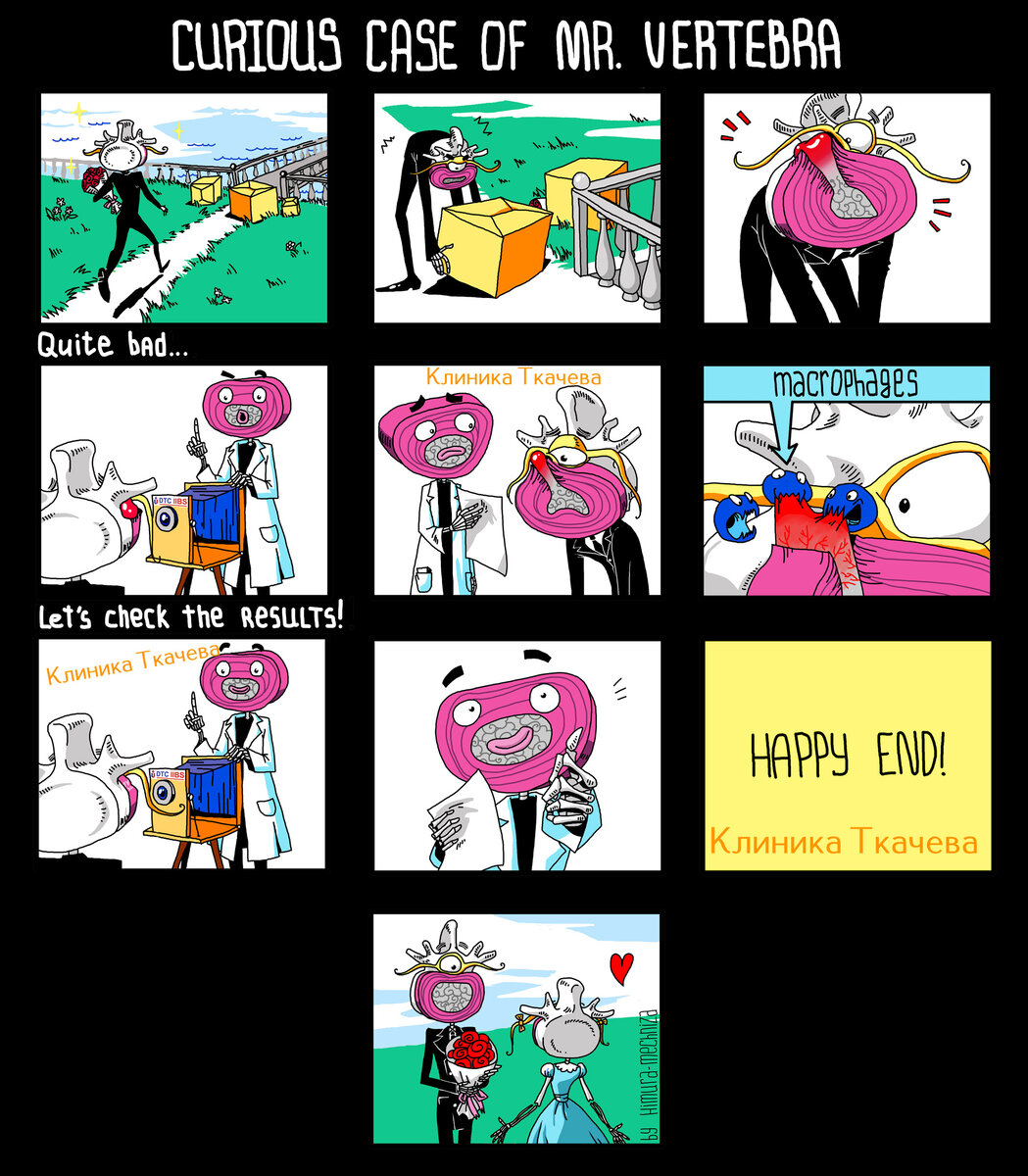 Небольшой комикс о Мистере Позвонке ( Mr.Vertebra), о том, как некстати у него появилась грыжа, и, конечно, о счастливом конце этой истории :)