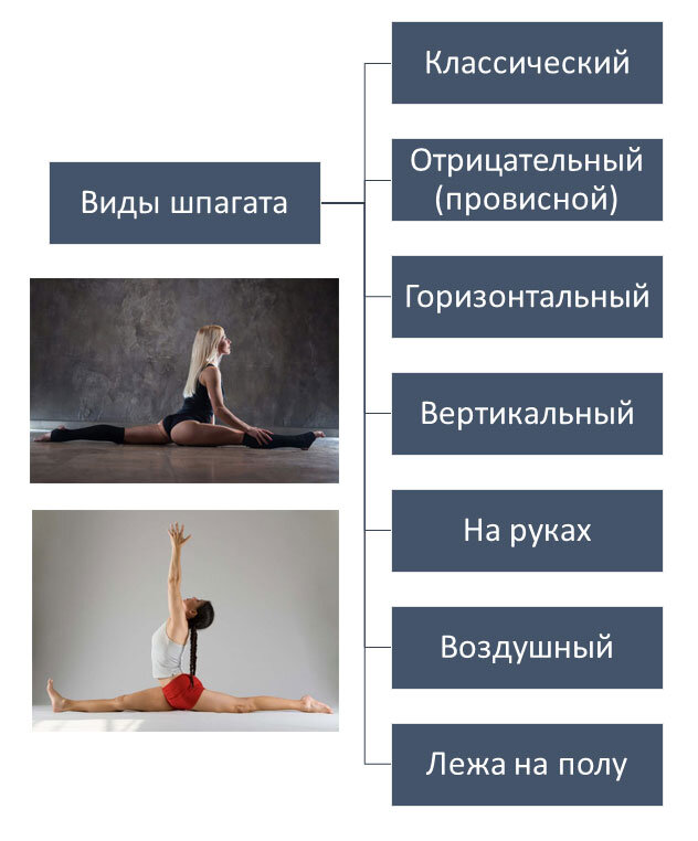 Шпагат - это такое упражнение или даже трюк на растягивание мышц и связок, в котором соблюдены нижеперечисленные условия: Виды шпагата Существует два базовых вида шпагата: продольный и поперечный. Первый вид выполняется так: одна нога находится впереди корпуса, а вторая направлена в противоположную сторону позади тела. Он в свою очередь делится на два подвида - левосторонний и правосторонний. Это зависит от того, какая нога впереди. В поперечном шпагате же ноги располагаются по бокам. Но это не вся классификация шпагатов. Существует еще несколько подвидов. Классический шпагат выполняется на полу, ноги параллельны полу и образуют прямую линию. Отрицательный шпагат выполняется с одной или двумя опорами. В этом случае угол между поверхностями бедер составляет больше 180 градусов. Горизонтальный шпагат - тот шпагат, в котором ноги параллельны полу. А в вертикальном шпагате они перпендикулярны ему. Шпагат на руках предполагает стойку на руках или локтях. Ноги в этом случае разводятся в ст