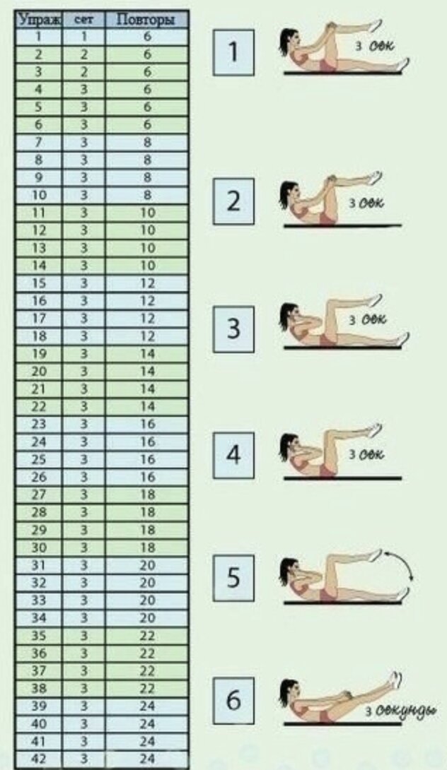 Сохрани, чтобы не потерять 📌 Аэробика для живота "шесть" Вейдера - представляет собой набор упражнений, которые вызывают сжигание жира в области живота и укрепляют мышцы. "Шесть" - состоит из 6 занятий в одном сете. Упражнения выполняются друг за другом без перерыва между собой. Главный момент в исполнении упражнений, задерживаться при движении на 2-3 секунды, когда мышцы наиболее напряжены. Для выполнения упражнений не понадобится дополнительного оборудования и инвентаря, поэтому вы можете легко заниматься дома. Программа рассчитана на 6 недель и заниматься нужно каждый день. Те, кто дойдет до конца, убедятся, что программа действует! Упражнения для пресса. Один сет состоит из 6 упражнений. Лягте на спину, руки вдоль туловища. Поднимите верхнюю часть туловища, руки подняты параллельно полу. И в то же время согните в колене под углом 90 градусов правую ногу, задержитесь на 2-3 секунды и вернитесь в исходное положение. Ладони должны касаться коленей. Тоже и с другой ногой. Второе упраж