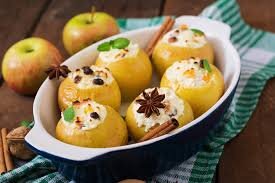 Мед — для подачи На 100 г — 243 ккал Приготовление: Удаляем из яблок сердцевину. Измельчаем орехи и сухофрукты. Смешиваем с маслом, корицей и сахаром. Начиняем яблоки сме