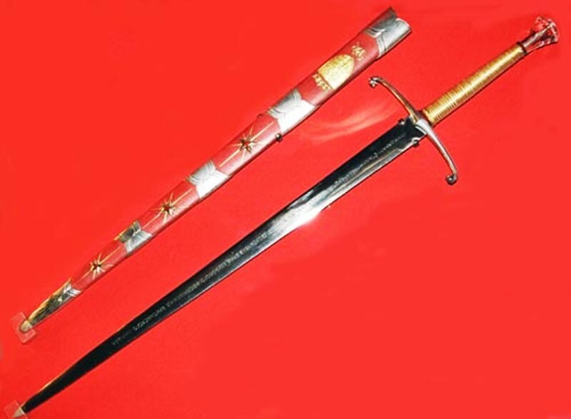 Был ли меч у Сталина? И что это за меч? Не многие об этом знают, да и сам я узнал об этом не так давно. Этот меч преподнесли нашему Верховному Главнокомандующему в 1943 году в Тегеране при встрече делегации Англии, США и России (Черчилль, Рузвельт и, разумеется, сам Сталин). Выкован он был по распоряжению короля Объединённого Английского Королевства George VI. Что же всё-таки представлял собой этот меч? Это прямой обоюдоострый клинок длиной 91 сантиметр, рукоять которого украшена золотой проволокой и на конце которой красуется герб Объединённого Английского Королевства, а это ничто иное, как золотая роза, сделанная из горного хрусталя. Ножны меча тоже украшены королевским гербом и тремя рубинами в виде красной звезды, между которыми находится пять накладок из серебра. Длина меча с рукояткой составляет около 122 сантиметров. В былые времена такие мечи носили крестоносцы. На самом клинке кислотой сделана гравировка текста. На одной стороне на русском, на другой - на английском языках. Су