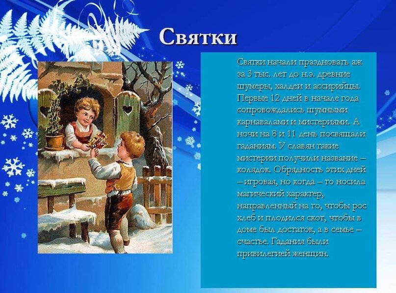 Рождественские святки празднуются в 2019 году с 7 по 19 января. С 6 января с начала Святок в наш мир живых возвращаются души умерших. С этого дня активируется нечистая сила. В святочные дни ведьм устраивают шабаш, беснуются и веселятся с нечистыми. Но, кроме этого, в эти важные рождественские дни, в которые возможно чудо. В народе этот период имеет много исторических названий. До принятия христианства святки были праздником в честь Святовита (одно из имен верховного бога неба — Белбога.) Святочные обряды в древности представляли собой заклинания на весь год и гадания о будущем. Рождественские святки – это особая праздничная пора, которая несет в себе нечто волшебное и удивительное. В эти дни принято веселится, отдыхать и радоваться. Святки это 12 дней между праздниками Рождества и Крещения. Время Рождественских святок отмечалось в древности с особым размахом. Люди верили, что в этот период нужно совершать добрые дела, помогать нуждающимся гражданам, чтобы в свой дом пригласить добрых