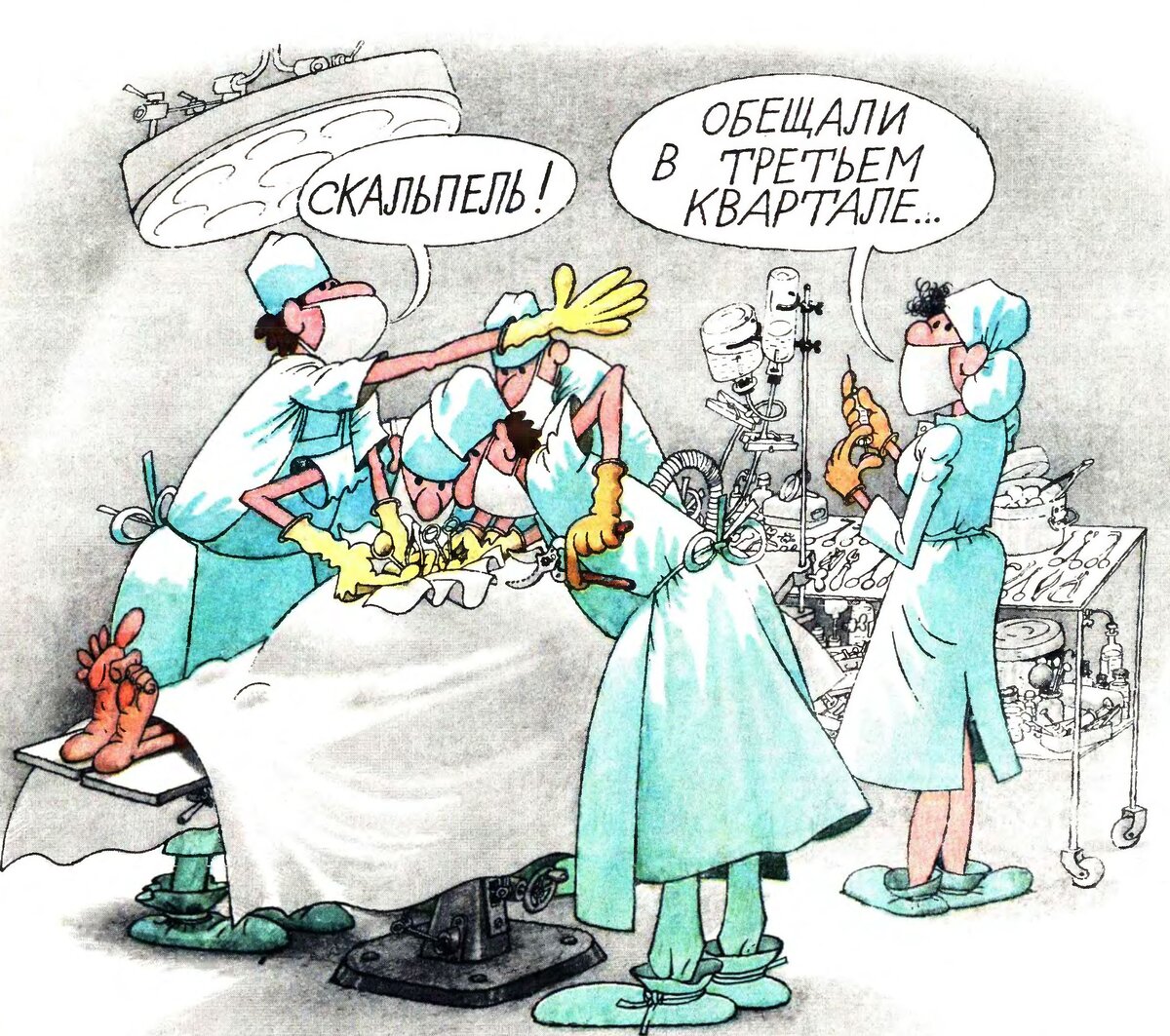 Всем привет! Настало время продолжить странствие по миру советской печатной сатиры, вновь обратившись к подшивкам журнала «Крокодил» – самого популярного в СССР сатирического периодического издания. На этот раз мы полистали выпуски за первую половину 1988 года и взяли оттуда наиболее интересные карикатуры. Давайте же посмотрим, над чем смеялась редакция этого журнала в ту пору, когда перестройка шла полным ходом, а большинство жителей страны и предположить не могло, что через три с небольшим года Советский Союз прекратит существование. ЧТО-ТО ИДЕТ НЕ ТАК... Сразу и не поймешь, над чем иронизирует автор данного рисунка. Есть, как минимум, два предположения. Первое – как всегда «дежурно» высмеивает нерасторопных производителей и снабженцев, по вине которых вечно срывается выход на плановые показатели. Второе – ставит на вид проблему дефицита лекарств и иных медицинских «расходников». Как известно, уже в 1990-м году СССР начал принимать «гуманитарку» от других государств, в составе которо