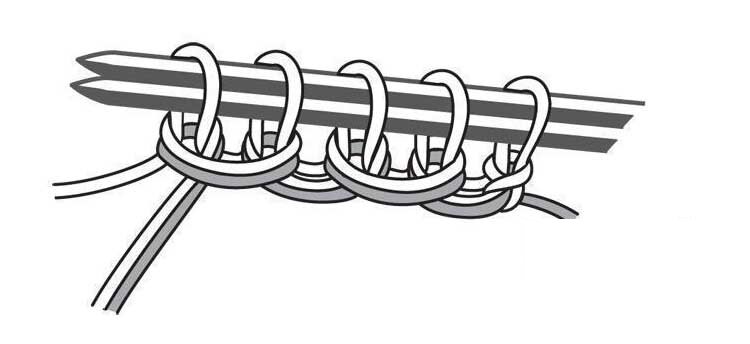 Крестообразный набор петель, другое название "болгарский зачин", нужен для вязания изделий, когда край выполняется без резинки и должен хорошо держать форму. Можно применить для получения красивой ровной кромки с объемным переплетением нити при вязании шапок бини лицевой гладью, чтобы к тому же край еще и не закручивался. Порядок работы: Набор петель выполняется двойной нитью. Для этого понадобится дополнительная нить как минимум вдвое большей длины, чем длина наборного края. Сначала выполнить начальную петлю, для чего середину дополнительной нити соединить с нитью клубка и выполнить начальную петлю. После этого идущую от клубка одинарную нить уложить, как обычно, вокруг указательного пальца и провести под пальцами (=нить указательного пальца). Двойную дополнительную нить снаружи вовнутрь провести под большим пальцем и удерживать под остальными пальцами вместе с нитью указательного пальца (=нить большого пальца). Теперь выполнить как обычно 1-ую петлю, т.е. спицу провести снаружи в