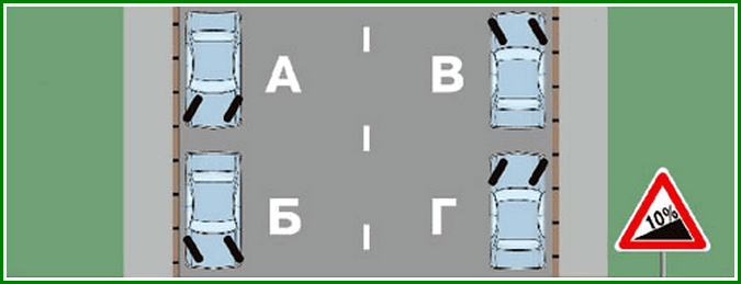 Сегодня поговори про вопрос, в котором нужна внимательность. Что бы разобраться в нем, во-первых нужно смотреть есть бордюр или нет. Многие пропускают эту мелочь и ошибаются в ответе. В данном случае вопрос звучит вот так: В случае остановки на подъеме (спуске) при наличии тротуара можно предотвратить самопроизвольное скатывание автомобиля, повернув его передние колеса в положение: 1. Б и В 2. А и В 3.А и Г 4. Б и Г Давайте разберемся. Для исключения непреднамеренного скатывания автомобиля выверните колёса так, чтобы возник упор в бордюр. Это препятствует дальнейшему передвижению автомобиля. И, наоборот, при отсутствии упора может произойти самопроизвольное скатывание автомобиля на проезжую часть. Эта мера является дополнительной к обязательным мерам, т.е. использованию стояночного тормоза и включению желательно более низкой передачи или заднего хода. (Пункт 12.8 ПДД.) На изображение автомобили находятся на подъеме. Автомобиль А упирается в бордюр, но этого нельзя сказать про авто