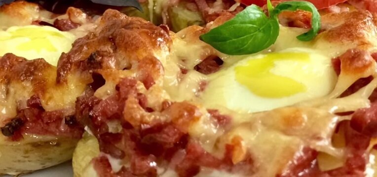 И выкладываем по краям картофеля колбасу, а в середину выливаем яйцо и сверху посыпаем сыром.