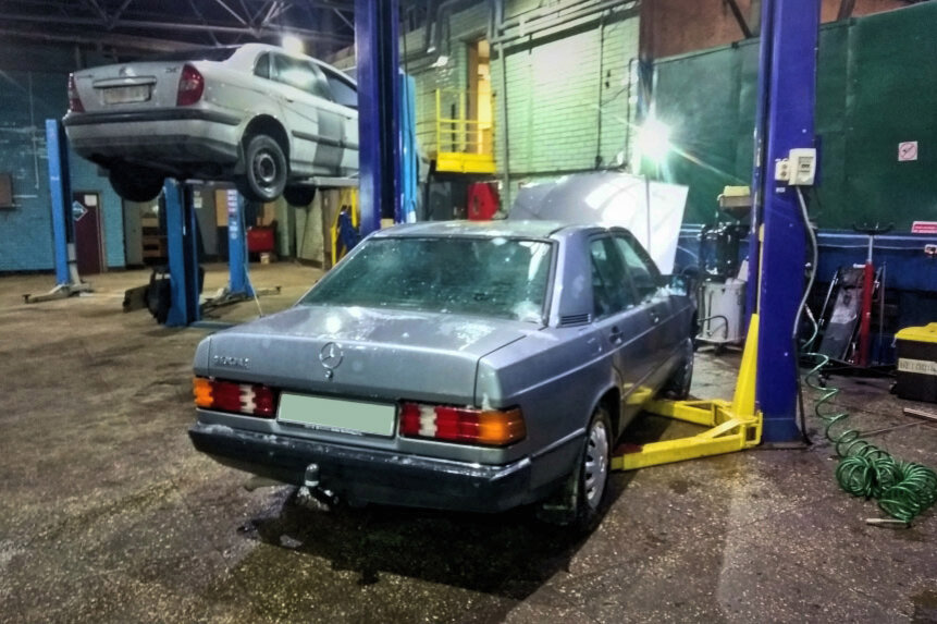Проводить эксперимент будем на Mercedes 190E, которому нужно поменять масло и масляный фильтр. Первоначально было желание поехать в гараж и сделать все самостоятельно, но зачем, когда некоторые центры по замене масел обещают сделать это бесплатно? Чтобы не было подозрений в рекламе, названия СТО, центров и масел в тексте будем опускать.