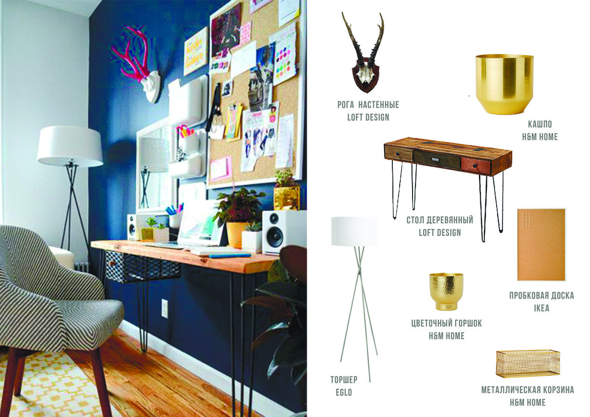 Работой на дому уже никого не удивишь, но и для нее лучше обустроить отдельное место - кабинет. Кто-то может позволить выделить под него целую комнату, кто-то обустраивает балконы или выделяет отдельные уголки гостиных. Но уникальный дизайн способен не только настроить на работу, но и повысить производительность! На фото: рога настенные Loft design - 2500, кашпо H&M home - 899, стол деревянный Loft design - 23200, торшер Eglo - 12990, цветочный горшок H&M home - 699, пробковая доска Ikea - 499, металлическая корзина H&M home - 899. На фото: поднос H&M home - 699, стул Loft design - 10600, кашпо H&M home - 1299, настольная лампа Loft design - 4650, стакан металлические H&M home - 699. Если у вас нет места для создания полноценного офиса, то следует проявить изобретательность: выбрать миниатюрный, но удобный стол, расположив его напротив окна в спальне. Таким образом эта зона будет вне поля зрения ваших гостей, и вы зонально разобьете комнату. На фото: стул Loft design - 11150