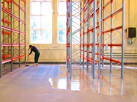 - эпоксидные покрытия будут незаменимы на производствах со значительной механической нагрузкой на пол, интенсивным его смачиванием различными жидкими химикатами;