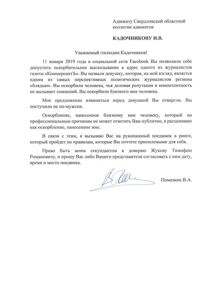 Екатеринбург ждет развития событий, которые развернулись прямо сегодня на просторах Фейсбука. Известный общественный деятель Вениамин Помазкин вызвал на дуэль не менее известного в Екатеринбурге и за его пределами адвоката Ивана Кадочникова, за то, что последний неосторожно высказался в своем посте об одной из журналисток региона. История прямо в духе Золотова и Навального! Я разговаривал с Вениамином. И этот вызов не фейк. Веня настроен серьезно, и попросил екатеринбургского депутата Тимофея Жукова под видеозапись передать Ивану этот вызов...