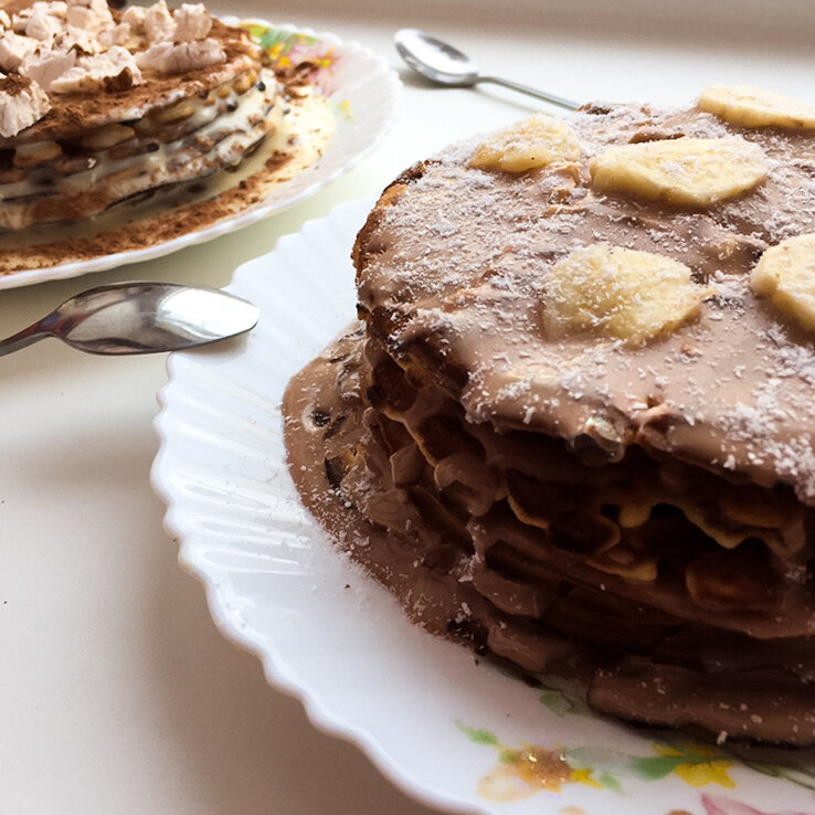 Торт - всегда ассоциируется с чем-то сложным и замудренным, но это не наш вариант! Эти вафельные торты довольно просты в приготовлении и если уж мне удалось укротить чугунную советскую вафельницу, то у вас точно все получится! Для самых вкусных тортов с теми самыми "вафельками из детства" нам нужно: -Яйца (2 шт)