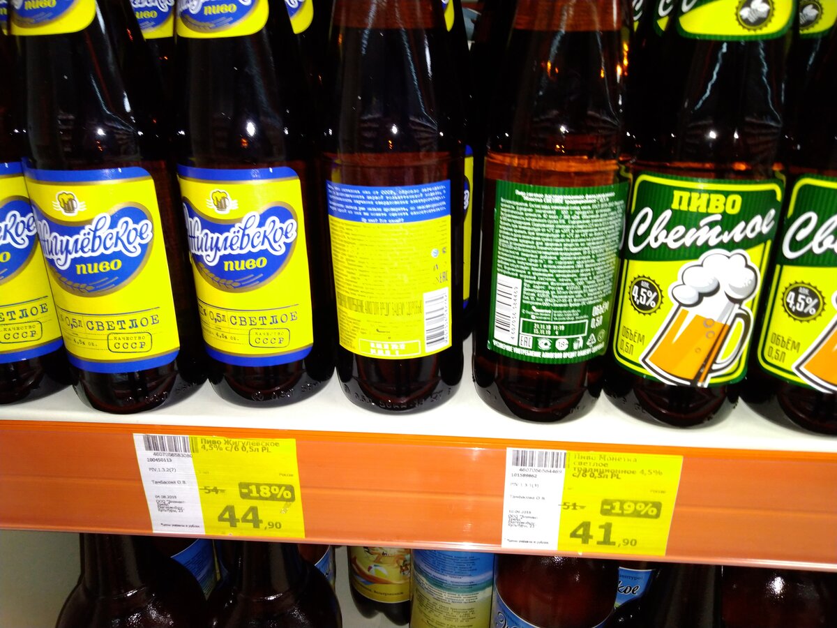 Заметил в магазине "Монетка" довольно интересное соседство. На одной полке рядом друг с другом притаилась компания "Жигулевского СССР" и "Светлого" пива. Первое манит своим исконным желто-синим "Жигулевским" окрасом и припиской "СССР", а второе пиво видимо манит рисунком кружки с "пенной шапкой" и чуть более низкой ценой. На оба пива как-раз была акция: "Жигулевское" стоило 54-90=, стало стоить 46,90= "Светлое" было когда-то раньше 52-90= , а стало 42-90=. Вообще, я честно сказать не помню, чтобы это пиво когда-либо продавалось без акции - желтый(акционный) ценник на нем присутствует всегда. Однако суть не в этом. Суть в другом! Вроде бы как два абсолютно разных пива, но нет. Это просто очередной мРакетологический "шедевр". На первое пиво "Жигулевское СССР" я уже делал обзор. Варит его пивзавод "Трёхсосенский", специально для "Монетки". Меня просто заинтересовало - что это за "СВЕТЛОЕ" пиво рядом, взял в руки бутылку и не поверил своим глазам! Производитель - тот же самый "ЗАВОД ТР