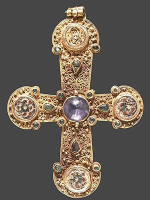 Крест золотой с камнями, 1150 г., Византия Золотой крест с камнями, 15 в., Новгород Делали кресты из разных материалов, в том числе и из золота. Золото испокон веков считалось самым ценным металлом, к тому же его блеск сравнивали с сиянием солнца и отождествляли с чем-то божественным, высоким. Но позволить себе украшения из золота могли только состоятельные люди: их носили цари и высокопоставленные особы.