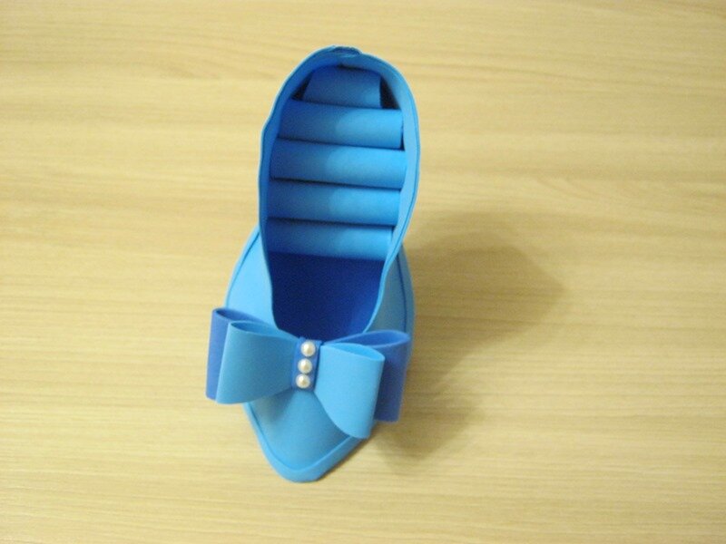 Из фоамирана можно сделать различные изделия. Вашему вниманию предлагаю мастер-класс, как сделать туфельку из фоамирана. Такую туфельку можно использовать, как игольницу или шкатулку под украшения. Этап 1 - Выкройка изделия и заготовки Вот такую туфельку предлагаю сделать вместе со мной. По такой выкройке будем делать туфельку из фоамирана. Для изготовления вырезаем по выкройке заготовки из картона. По шаблонам из картона вырезаем заготовки из фоамирана. Используем фоамиран 2 мм темно-голубого цвета. Этап 2 - Сборка туфельки Часть деталей для туфельки вырезаем из светло-голубого фоамирана 1 мм. Берем подошву и начинаем приклеивать с середины носка, приклеиваем внахлест. Приклеиваем в начале на середины подошвы с одной стороны, потом с другой. Затем продолжаем склеивать до конца подошвы. Берем бигуди и отмеряем 10 см. Отрезаем на откос, высота каблука должна 9,5 см. Берем кусочек фоамирана и обклеиваем каблучок. Затем берем кусочек фоамирана и подклеиваем каблучок, делаем к