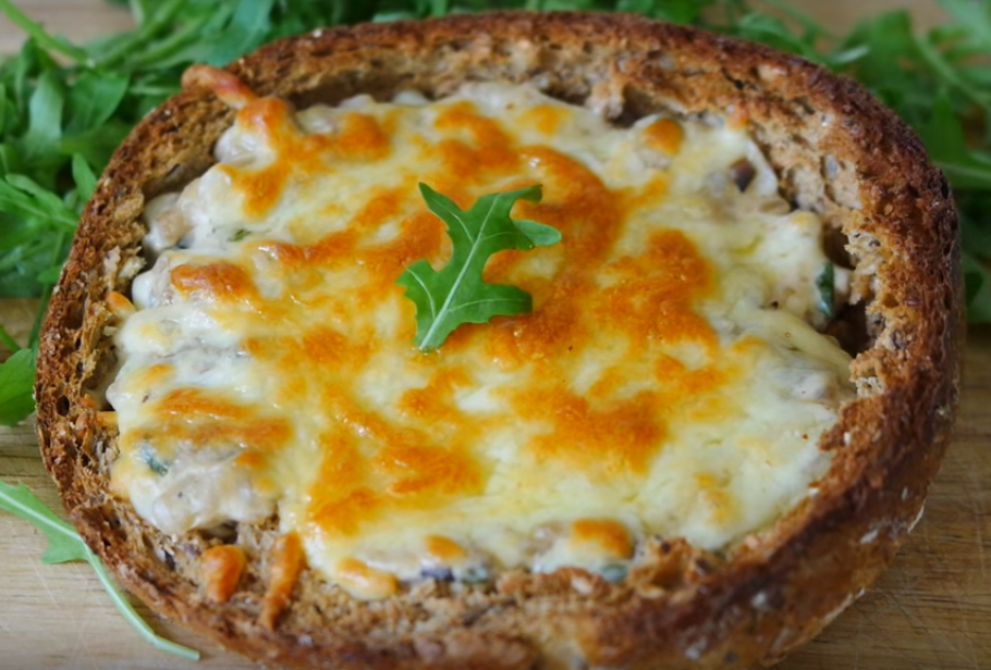 Нам понадобятся: шампиньоны - 250 гр луковица ( небольшая) - 1 шт. мука - 1 ст. л. сметана - 200 гр сливочное масло - 50 гр зелень (петрушка, укроп) соль и перец по вкусу тертый сыр буханка хлеба 1. Порежьте лук кубиками и обжарьте его на разогретой сковороде на сливочном масле до золотистого цвета около 5 минут. 2. Нарежьте грибы небольшими ломтиками и добавьте в сковороду с луком. Готовить до полного испарения воды еще примерно 5-7 минут. 3. Добавьте зелень, соль и перец, хорошо перемешайте, а затем добавьте муку и снова перемешайте. 4. Добавить сметану и хорошо перемешать, чтобы не было комков, жарить еще 1-2 минуты. Можно добавить немного воды, если смесь становится слишком сухой. 5. Разрежьте хлеб пополам, вырежьте середину и сделайте чашу. Хлеб можно брать любой формы. Добавьте грибную смесь внутрь. Посыпьте сверху сыром Поставьте в духовку (если есть, то на гриль) при высокой температуре на 10 мин, пока сыр не станет золотистым. Приятного аппетита! Приятного