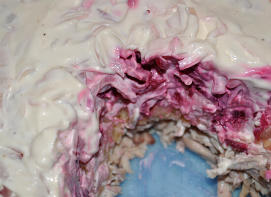 6 слой - свекла, натертая на терке. Сверху тоже см