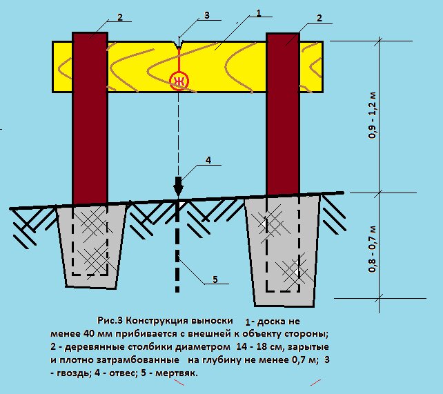 При условии, что строительная площадка до разбивки зачищена и её плоскость приближена к горизонтальной рабочие расстояния для построения прямого угла могут быть увеличены в двое (6,8,10 м), точность построения угла увеличивается. Следующая операции это провешивание осей 1и 5, нахождение точек пересечения этих осей с осью Ж , путем промеров от оси А. Затем шнуром и рулеткой оси выносятся за контуры стройплощадки, где закрепляются выносками (см. рис. 1). В намеченном для устройства выноски месте перпендикулярно оси подвешивают на два предварительно вкопанных столбика доску (см. рис 3). Доска крепится на высоте 0,8 - 1,1 м. Отвесом обозначенная вытянутым шнуром ось поднимается на верхнюю кромку доски, где ножовкой делается треугольный вырез и в вырез забивается гвоздь ( в процессе строительства на гвоздь будет натягиваться проволока для провешивания оси над траншеей, или котлованом). На доске яркой краской в продолжение выреза рисуют черту и четко подписывают вынесенную ось. На случай потери выноски в процессе строительства под ней устраивают так называемый «мертвяк». Для его устройства подойдет обрезок арматурного стержня, или газовой трубы длиной 0,7 м. Арматуру забивают по центру оси до поверхности земли. Расстояние по горизонту от выноски до отмеченных на земле углов здания тщательно промеряют и записывают (см. Рис. 1).