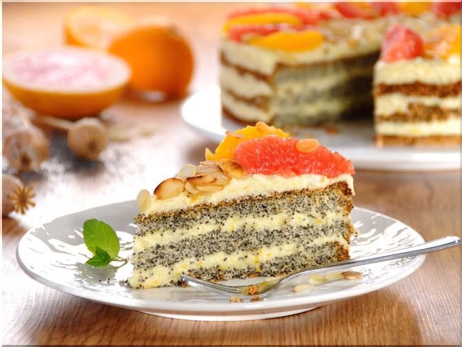 Здравствуйте, дорогие читатели!) Пирог из макового пудинга - это идеальное предложение для сладкой закуски, который можно испечь на День Рождения. Он сочетает в себе характерный вкус семян мака, нежный кремовый пудинг и слегка кислые фрукты. Время приготовления: 45 минут Ингредиенты: тесто крем украшение: Приготовление: 1) Маргарин растворить в кастрюле. 2) Отделите желтки от белков. Взбить белки с сахаром в пену. 3) Смешайте муку с разрыхлителем и маком.Добавьте взбитые белки, перемешайте миксером. Потом налейте растопленный маргарин и осторожно размешайте ложкой. 4) На дно формы положить бумагу для выпечки. Вылить тесто в форму и выпекать около 30 минут при температуре 170°С. Разрежьте получившийся корж на 3 части. 5) Натрите цедру 1 апельсина. Разогрейте половину молока вместе с апельсиновой цедрой, в оставшемся молоке высыпьте порошок пудинга. Вылейте молоко с пудингом в кипящее молоко и варите, помешивая, пока не образуется густой пудинг. 6) Взбить пудинг с помощью миксера,