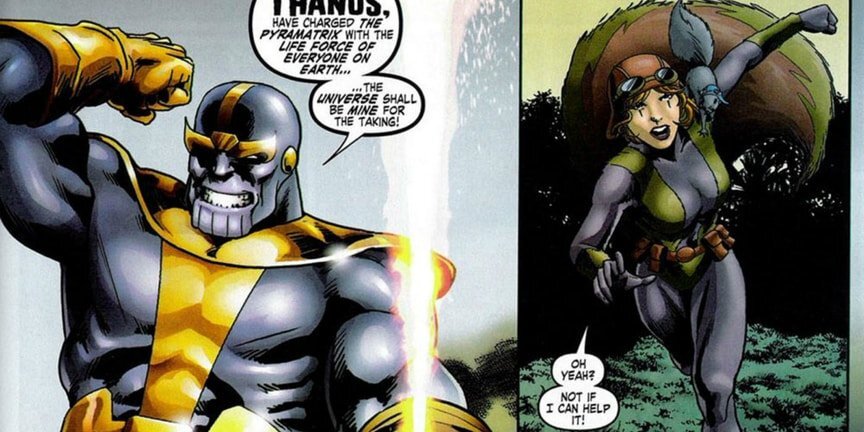 Безумный титан Танос, знаменитый враг Мстителей, Стражей Галактики и всей Земли в комиксах Marvel, в третьих «Мстителях» полноценно появится в киновселенной Marvel. Таноса знают благодаря его безграничной силе и космическим артефактам, которые позволяли ему манипулировать самой вселенной. Но в комиксах неоднократно появлялись персонажи, которые силой или хитростью побеждали Таноса. Их мы и решили вспомнить в этом материале. Девочка-белка В рождественском выпуске серии Great Lakes Avengers – GLX-Mas Special– команда сталкивается с Таносом. Других супергероев в этот период времени нет – все заняты, поэтому Девочка-белка сама вызывается проучить Таноса и побеждает его. Возможно, ей это удалось благодаря тому, что Безумный титан недооценил супергероиню, умеющую общаться с белками и контролировать их, но факт остается фактом – она победила Таноса с помощью белок, ловкости и хитрости. Дракс Во время одного из глобальных космических событий – Annihilation, Танос решил использовать Дракса