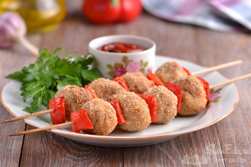 Готовим потрясающе вкусные шашлычки в духовке из свиного фарша, сладкого сочного перца с добавлением острого красного перца и хмели-сунели. Порции 2 Время приготовления 50 минут Ингредиенты Инструкции 1. Для приготовления использовала бамбуковые шпажки длиной 30 см. Это дерево и оно будет гореть в духовке при высоких температурах. Чтобы уменьшить этот процесс, просто за 30-40 минут до начала приготовления замачиваем их в холодной воде. 2. Фарш берем домашний, в который при измельчении уже добавили репчатый лук и чеснок, или используем купленный в магазине и обязательно дополняем его мелко нарезанным луком и чесноком. У меня домашний фарш. Посыпаем его солью, хмели-сунели, молотыми черным и красным острым перцами. 3. Высыпаем сверху панировочные сухари (2 ст. л.), очень хорошо перемешиваем и отбиваем (берем в ладонь и ударяем о дно миски). В фарш не добавляем яйца, иначе он станет жидковатым и не будет держаться на палочках. Фарш и без яиц будет хорошо скреплен сухарями и п