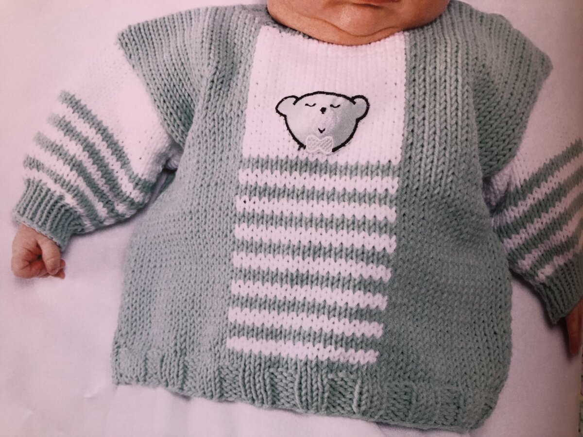 Свитер спицами на новорожденного вяжется просто, основываясь на лицевых и изнаночных петлях. Данная схема подходит на рост 50 — 56 см. Возраст: 1 — 4 месяца. Потребуется: Мятно-белый цвет подойдет как девочке, так и мальчику. Узоры и виды петель Лицевая гладь. 1й ряд все петли лицевыми, 2й ряд — все петли изнаночными. Повторить эти два ряда. Резинка 1 х 1 (* 1 лицевая петля, 1 изнаночная петля. * — повторять от * до *), резинка 3 х 2 (*3 лицевых петли, 3 изнаночные, повторять от * до *). Последовательность чередования полос: 2 ряда нитью цвета мяты, 2 ряда нитью белого цвета. Плотность вязания 10 х 10 см = 18 петель х 27 ряда лицевой гладью. Нужно связать образец на спицах № 3,5. Набрать 18 петель и провязать лицевой гладью 27 ряда. С изнаночной стороны вязать изнаночными петлями. Сверить, получился ли у вас размер образца 10 х 10 см. Если погрешность составляет до 0,5 см, можно оставить так. Если больше — следует рассчитать свою плотность вязания и корректировать данное описание