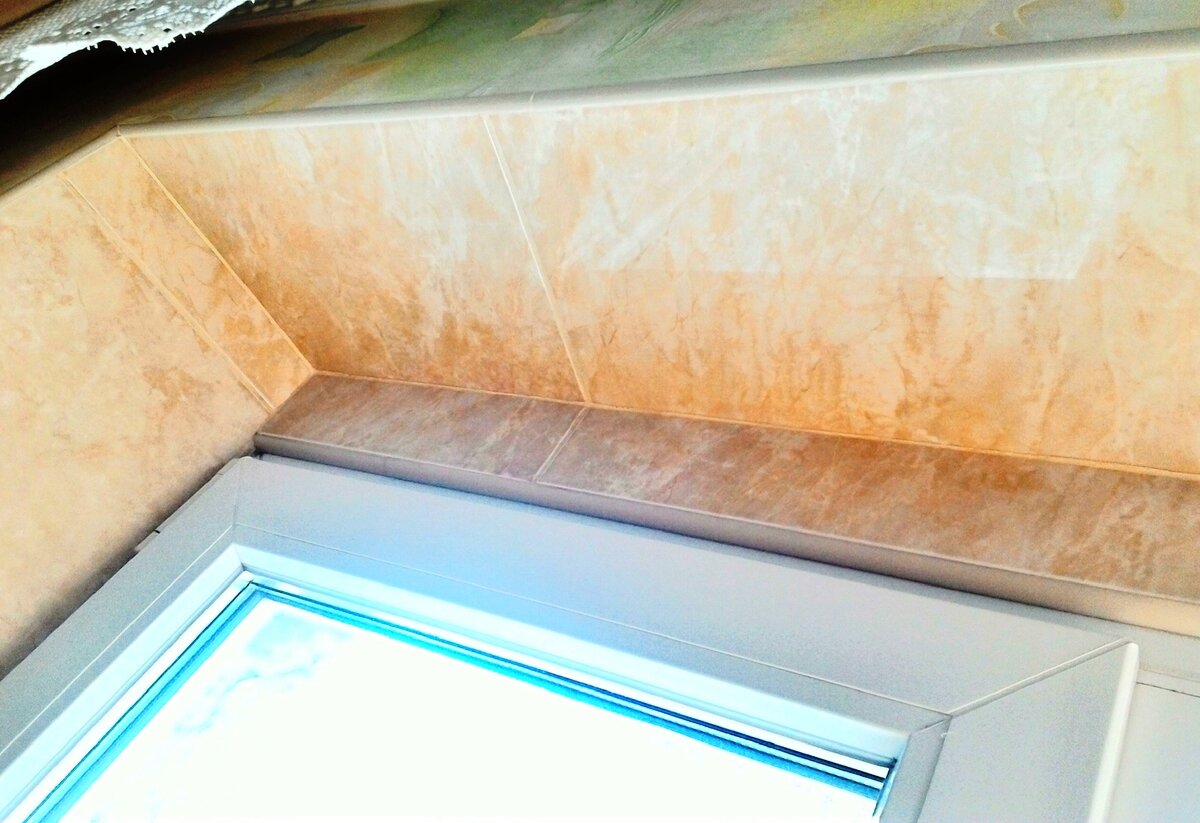 В конце статьи представлено видео с обзором этого проекта. Приветствую подписчиков и гостей канала Мастер-Ок! Перед вами еще один вариант отделки откоса керамической плиткой, который также можно оценивать. Лучшая оценка - нажать кнопку подписки Так пойму, что публикация нужна и практична. Проект оконного откоса на кухне похож на описание откоса в спальной и имеет свои достоинства. Плитка в обоих помещениях использовалась одинаковая, поэтому постарайтесь увидеть разницу. Исходные данные Подобный способ оформления - вынужденная мера, продиктованная ошибками компании, устанавливавшей пластиковые рамы. По высоте они получились меньше необходимого на 5-7 см и, чтобы не накладывать сверху несколько слоев штукатурки, принято решение заполнить штукатуркой только зазор , а затем закрыть его плиткой в вертикальной плоскости. На снимке неплохо просматривается вертикальные плоскости и немного виден верхний откос, который в данном случае интересен больше всего. Особенности работ 1. Вышло та